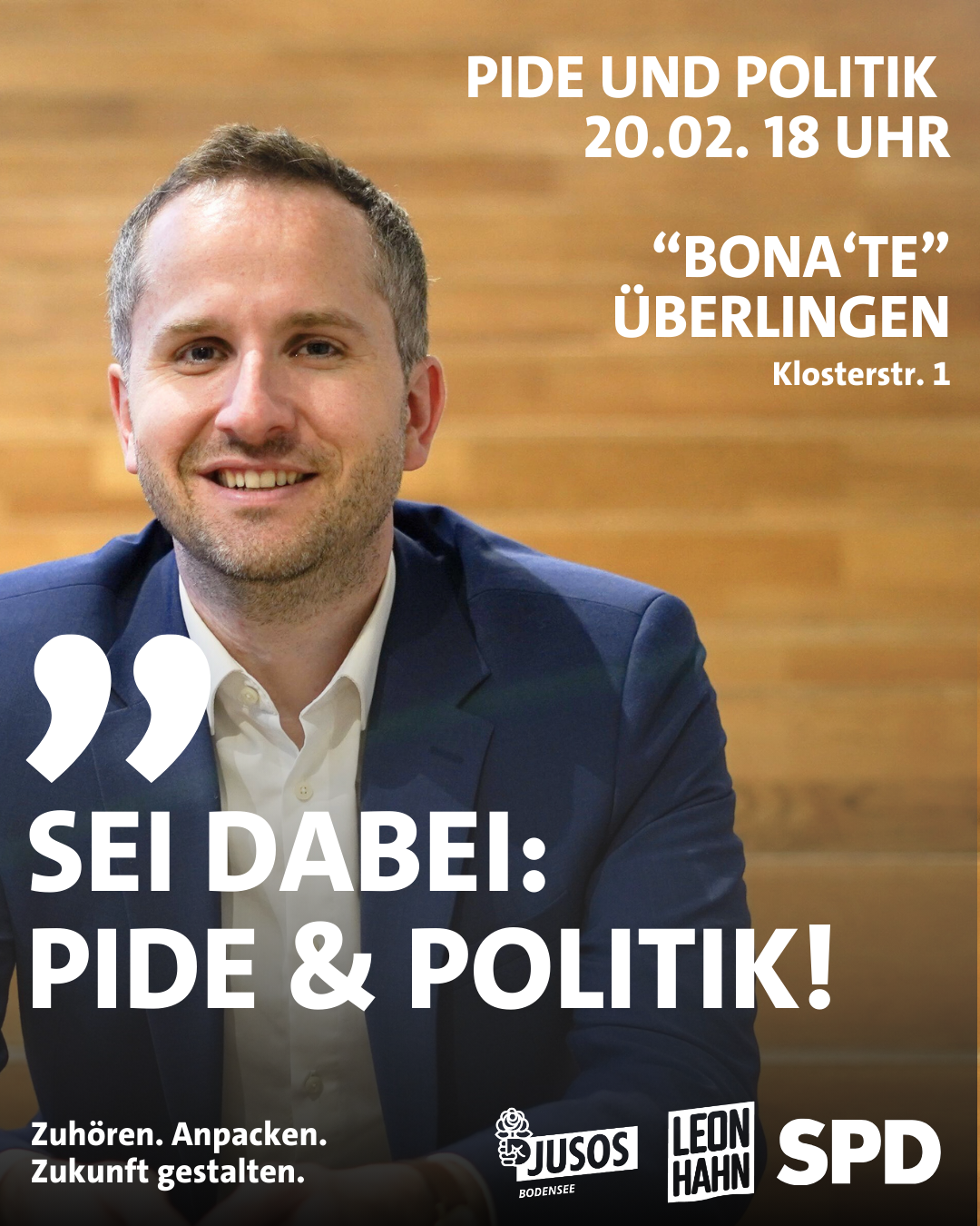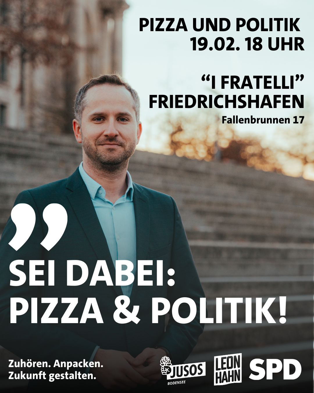 Bei leckerer Pizza und einem kühlen Getränk sich gemeinsam mit dem Kandidaten für den Bundestag unterhalten, das Planen die Jusos im Bodenseekreis. Die Jugendorganisation der SPD möchte damit gerade jungen Leuten ein Angebot schaffen, sich kurz vor der Bundestagswahl sich im lockeren Rahmen zu informieren. Dazu gibt es zwei Termine, bei denen SPD-Bundestagskandidat Leon Hahn sich den Fragen der jungen Bürgerinnen und Bürger stellt und erzählt was seine Pläne im Bundestag sind. Der erste Termin findet am 19.02. ab 18:00 Uhr im I Fratelli (Fallenbrunnen 17, 88045 Friedrichshafen) unter dem Motto Pizza & Politik statt. Unter dem Motto Pide & Politik findet das gleiche Format am 20.02. ab 18:00 Uhr im Bona’te (Klosterstr. 1, 88662 Überlingen) statt.